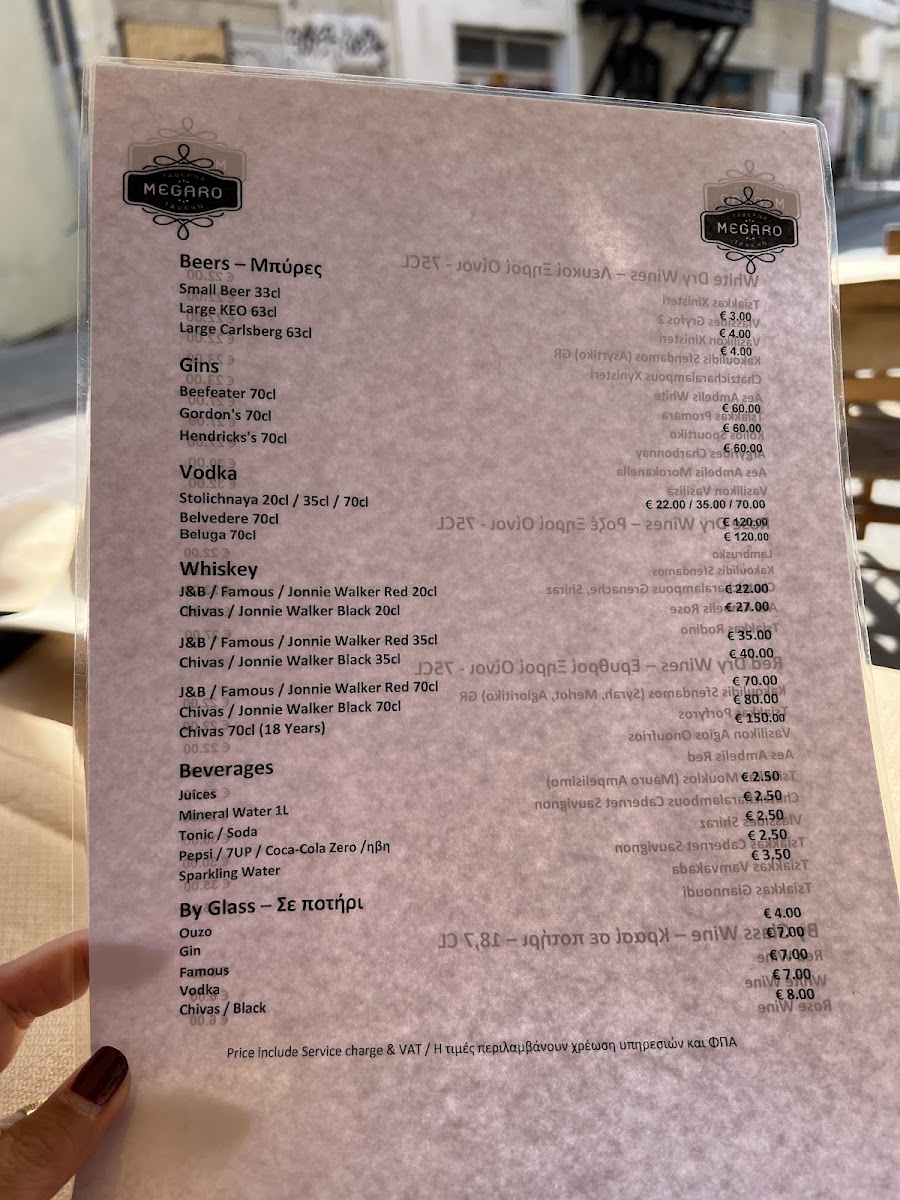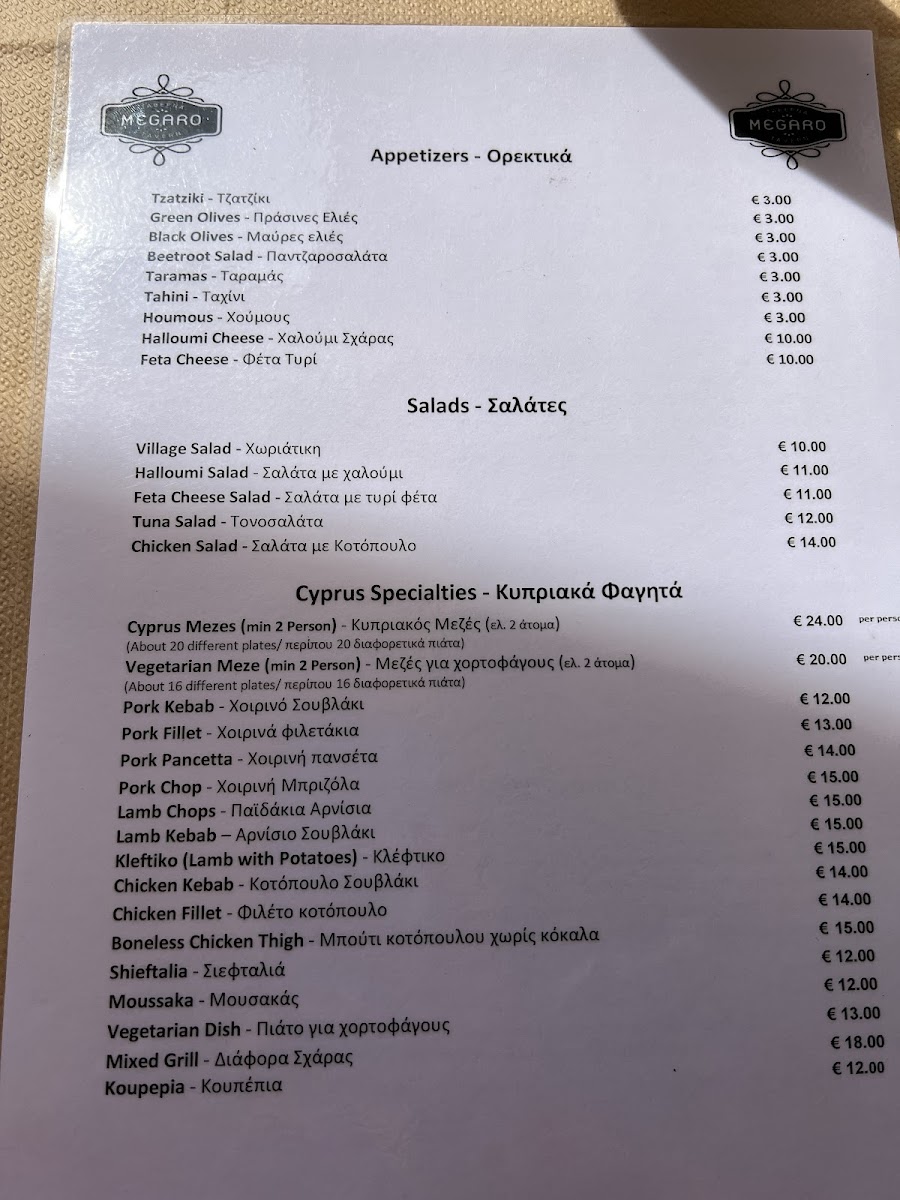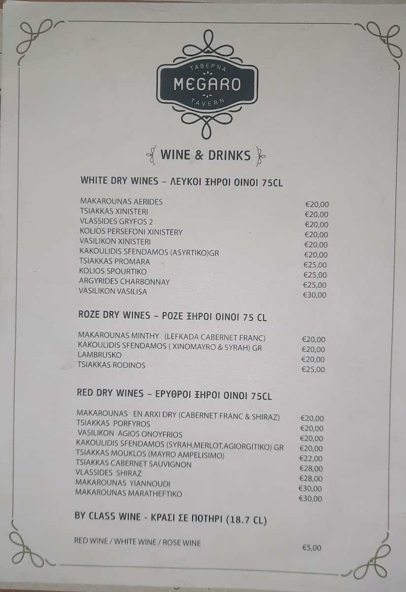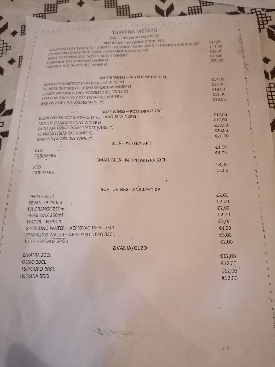 The menu at Megaro Restaurant in Limassol offers a selection of delightful dishes and beverages. For seafood lovers, the Χταπόδι (octopus) is a standout, paired perfectly with the refreshing Ούζο 20cl (Ouzo). The Διάφορα Σχάρας Επιλογή 1Ivi Πορτοκάλι 250ml (various grilled options with orange) provides a unique twist, while the Pepsi 250ml serves as a classic refreshment to complement the flavors. For wine enthusiasts, the menu presents two excellent choices of Ροζέ Ξηροί Οίνοι 75cl (dry rosé wines): Lambrusko and Tsiakkas Rodinos, both offering a fine selection for pairing with the dishes. The prices of these offerings may vary, but each dish promises an inviting and flavorful experience at this charming Cypriot restaurant.