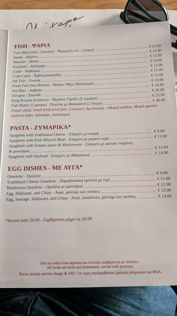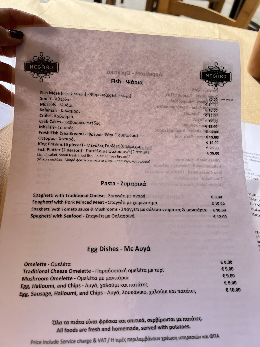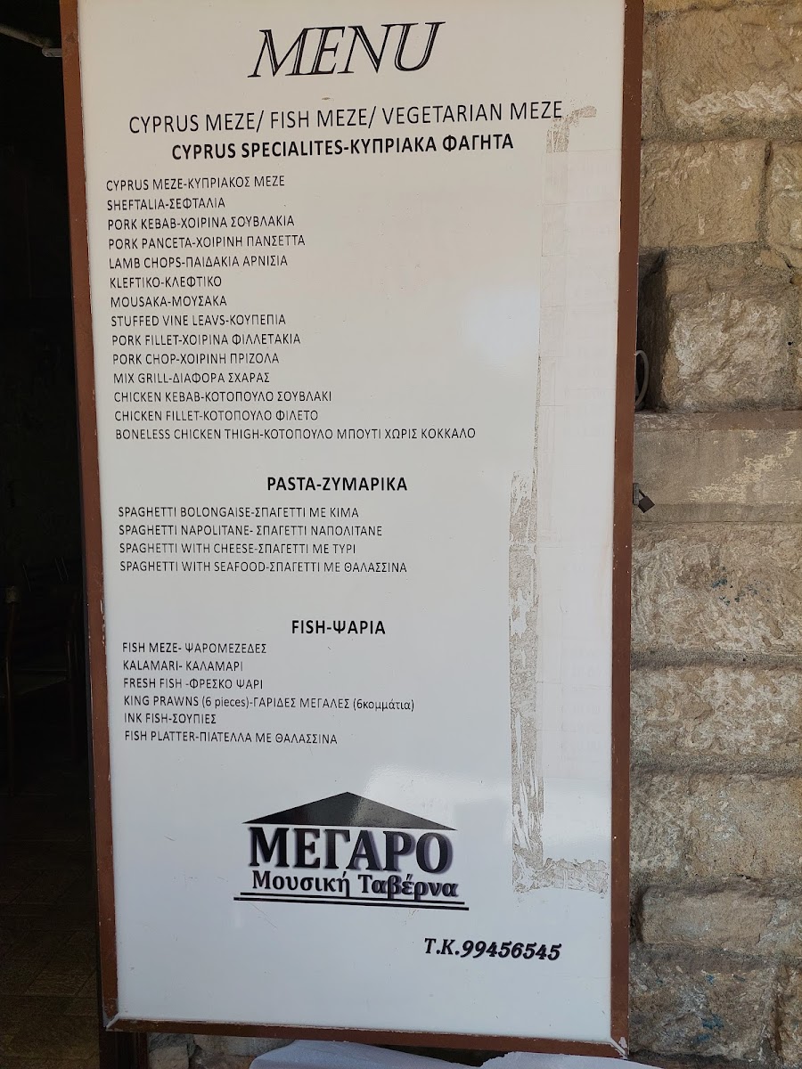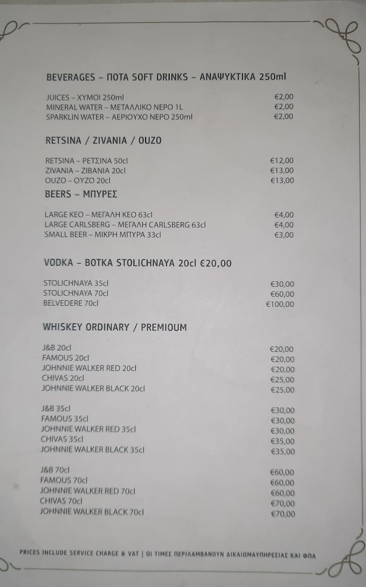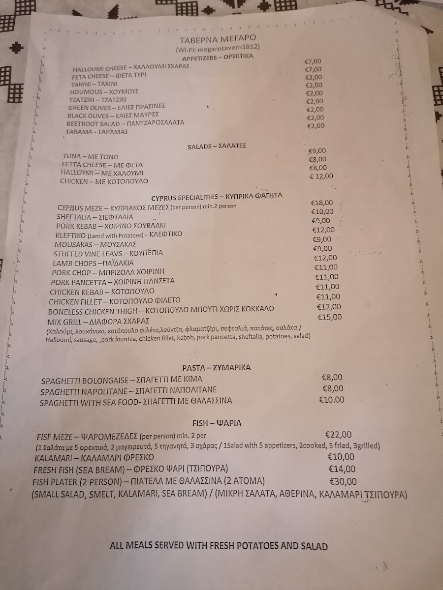 The menu at Megaro Restaurant in Limassol offers a selection of delightful dishes and beverages. For seafood lovers, the Χταπόδι (octopus) is a standout, paired perfectly with the refreshing Ούζο 20cl (Ouzo). The Διάφορα Σχάρας Επιλογή 1Ivi Πορτοκάλι 250ml (various grilled options with orange) provides a unique twist, while the Pepsi 250ml serves as a classic refreshment to complement the flavors. For wine enthusiasts, the menu presents two excellent choices of Ροζέ Ξηροί Οίνοι 75cl (dry rosé wines): Lambrusko and Tsiakkas Rodinos, both offering a fine selection for pairing with the dishes. The prices of these offerings may vary, but each dish promises an inviting and flavorful experience at this charming Cypriot restaurant.
