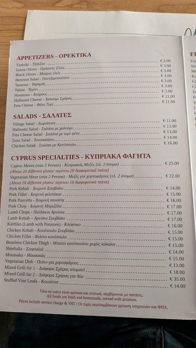 Σουβλάκι χοιρινό, κοτόπουλο μπούτι, χοιρινή πανσέτα, αρνίσιο σουβλάκι, χαλλούμι, μανιτάρι. Συνοδεύεται με τηγανητές πατάτες, σαλάτα και Κυπριακή πίτα. Για 1 άτομο